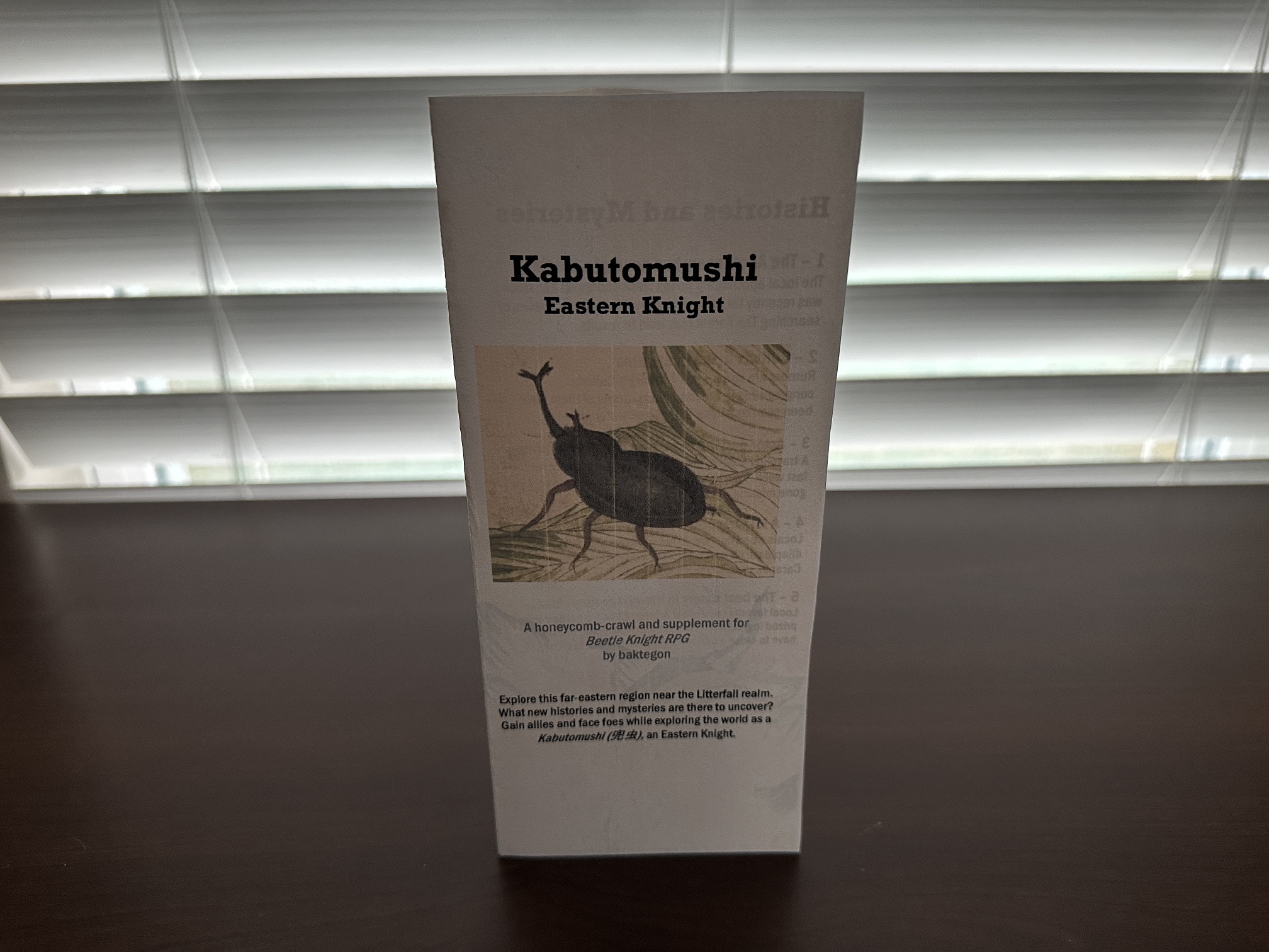 Kabutomushi - A Beetle Knight Crawl is a pamphlet supplement and honeycomb (hex) crawl designed for Beetle Knight RPG as part of the Beetle Knight Pamphlet Jam